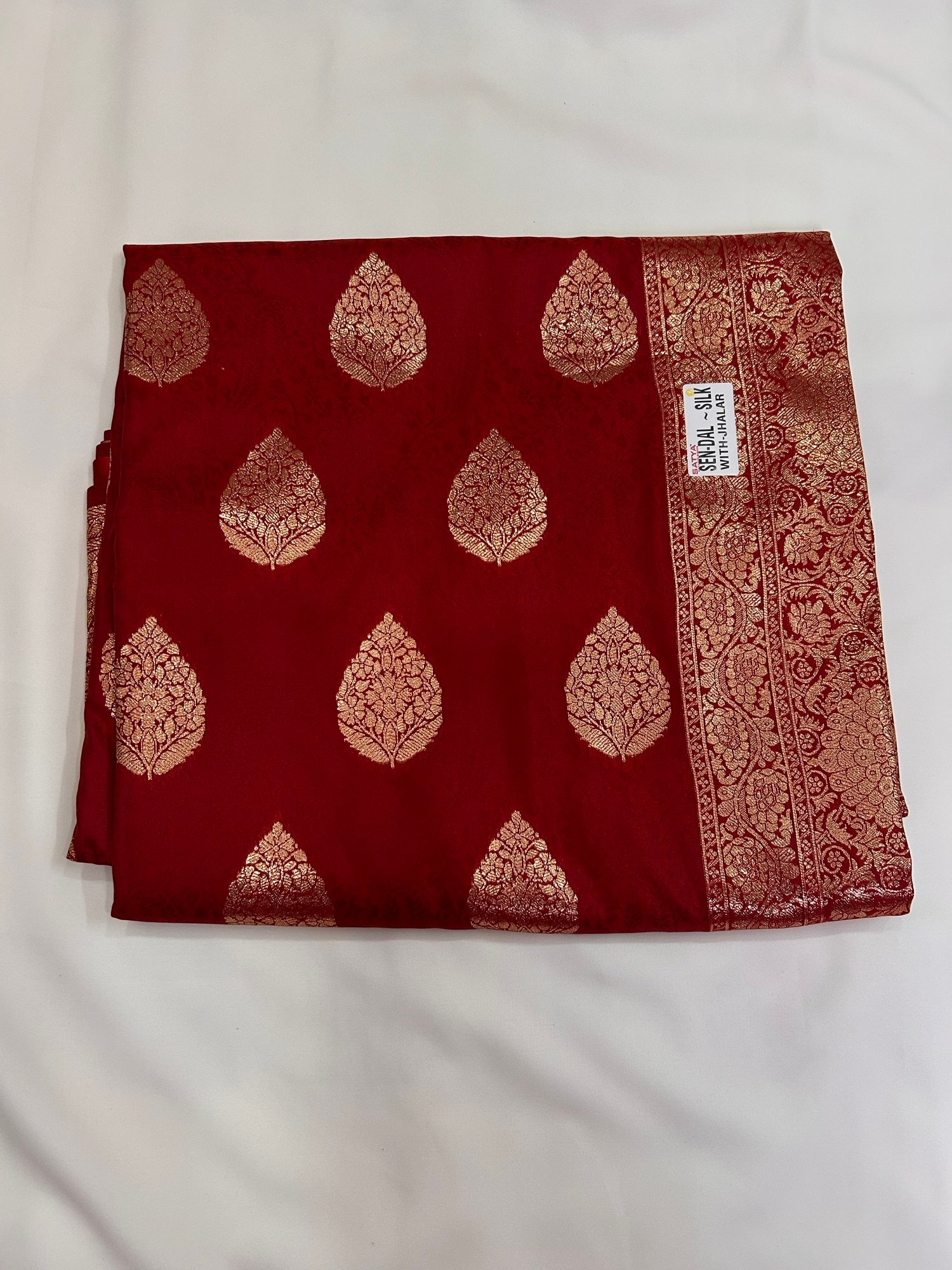 Made from high-quality fabric, the saree drapes smoothly and adds a luxurious shine with every movement. The zari border and pallu highlight traditional craftsmanship while maintaining a modern appeal.