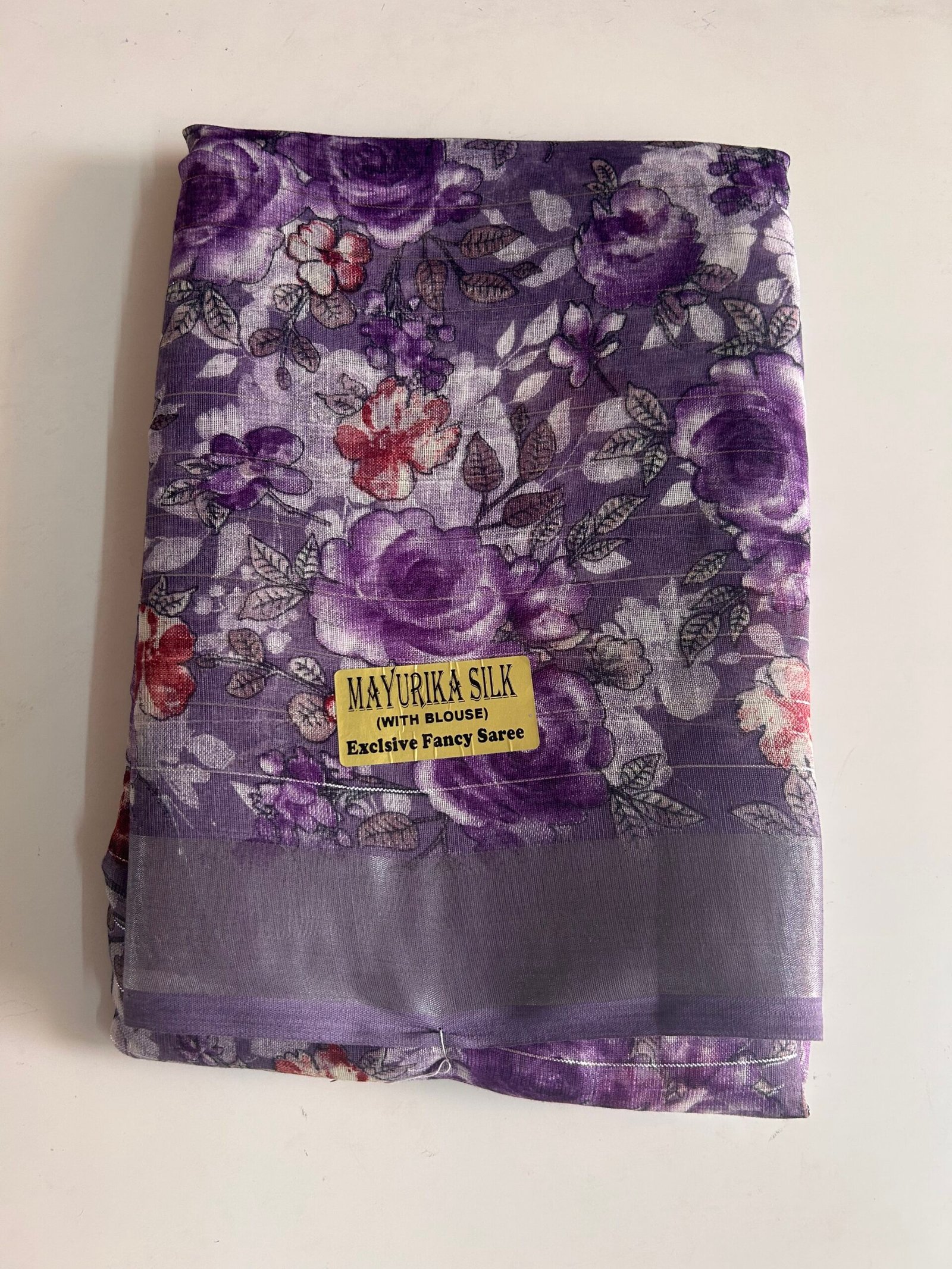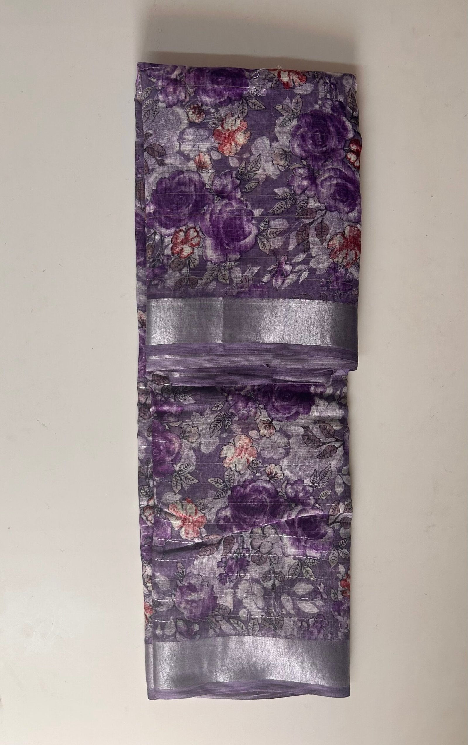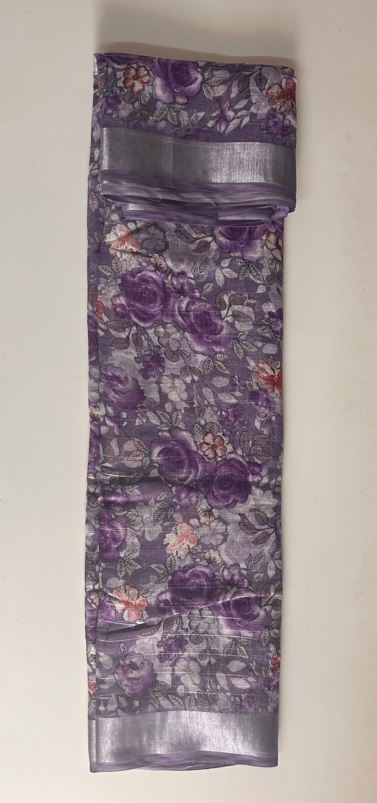 Enhance your elegance with this beautifully designed Purple Floral Linen Cotton Saree, crafted for modern women who love a blend of comfort and style. Featuring a stunning floral print in rich purple tones, this saree brings a fresh, graceful, and feminine charm to your wardrobe.