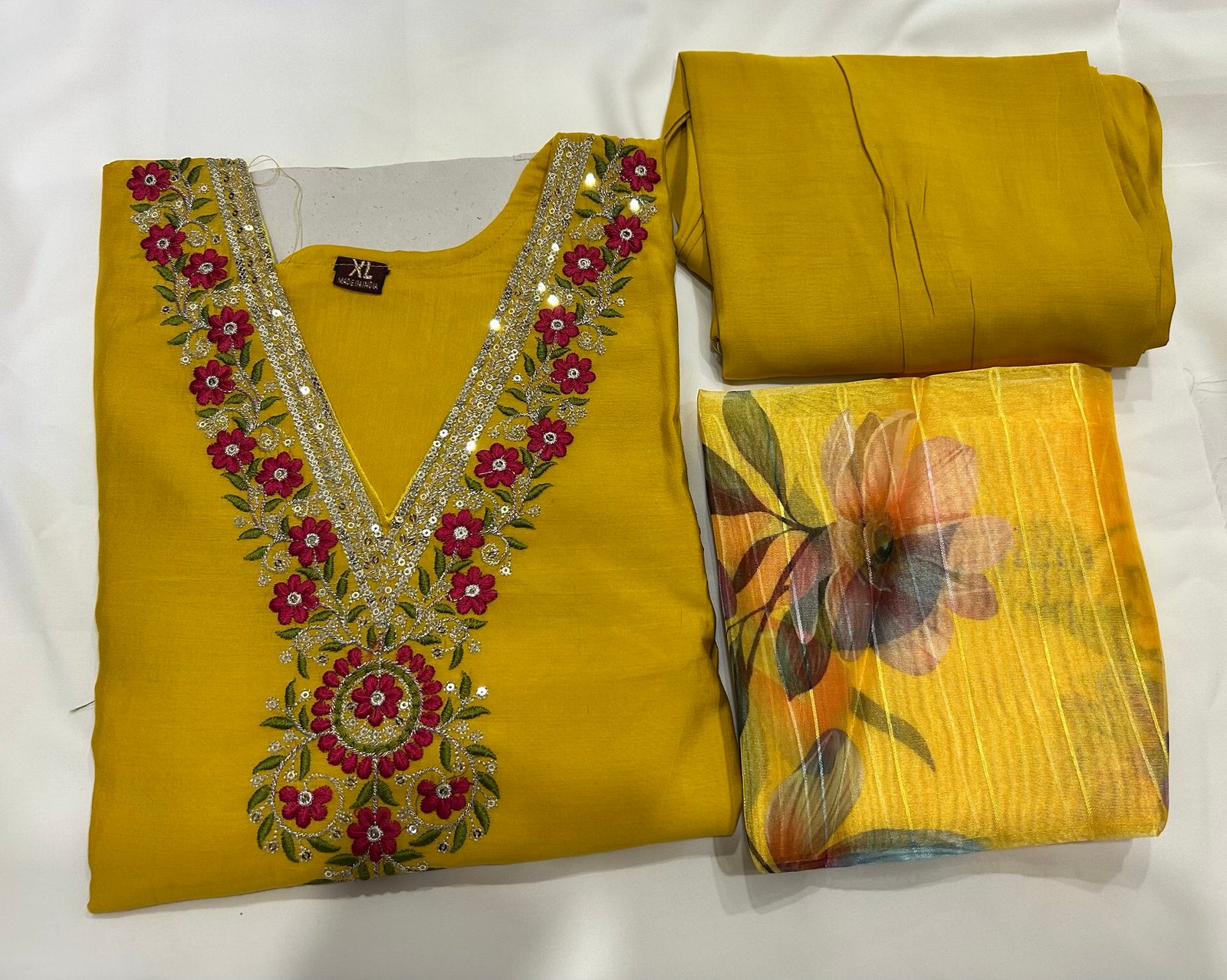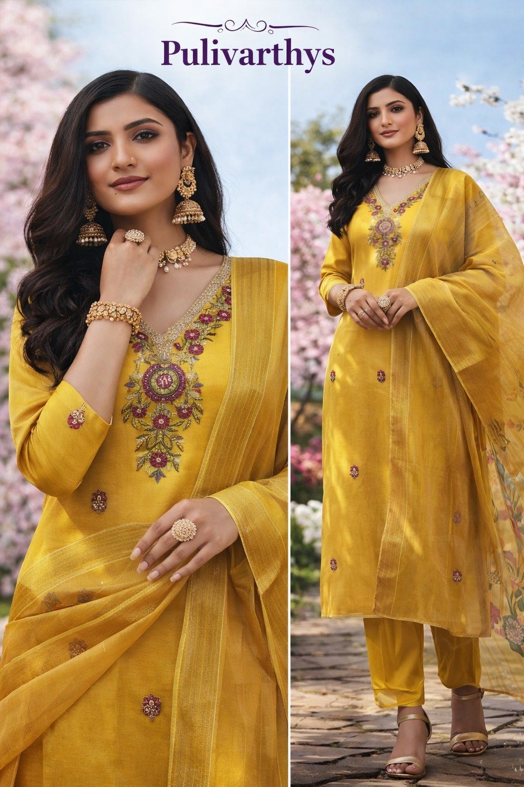 Beautiful party wear yellow colour flower embroidery chudidhdar